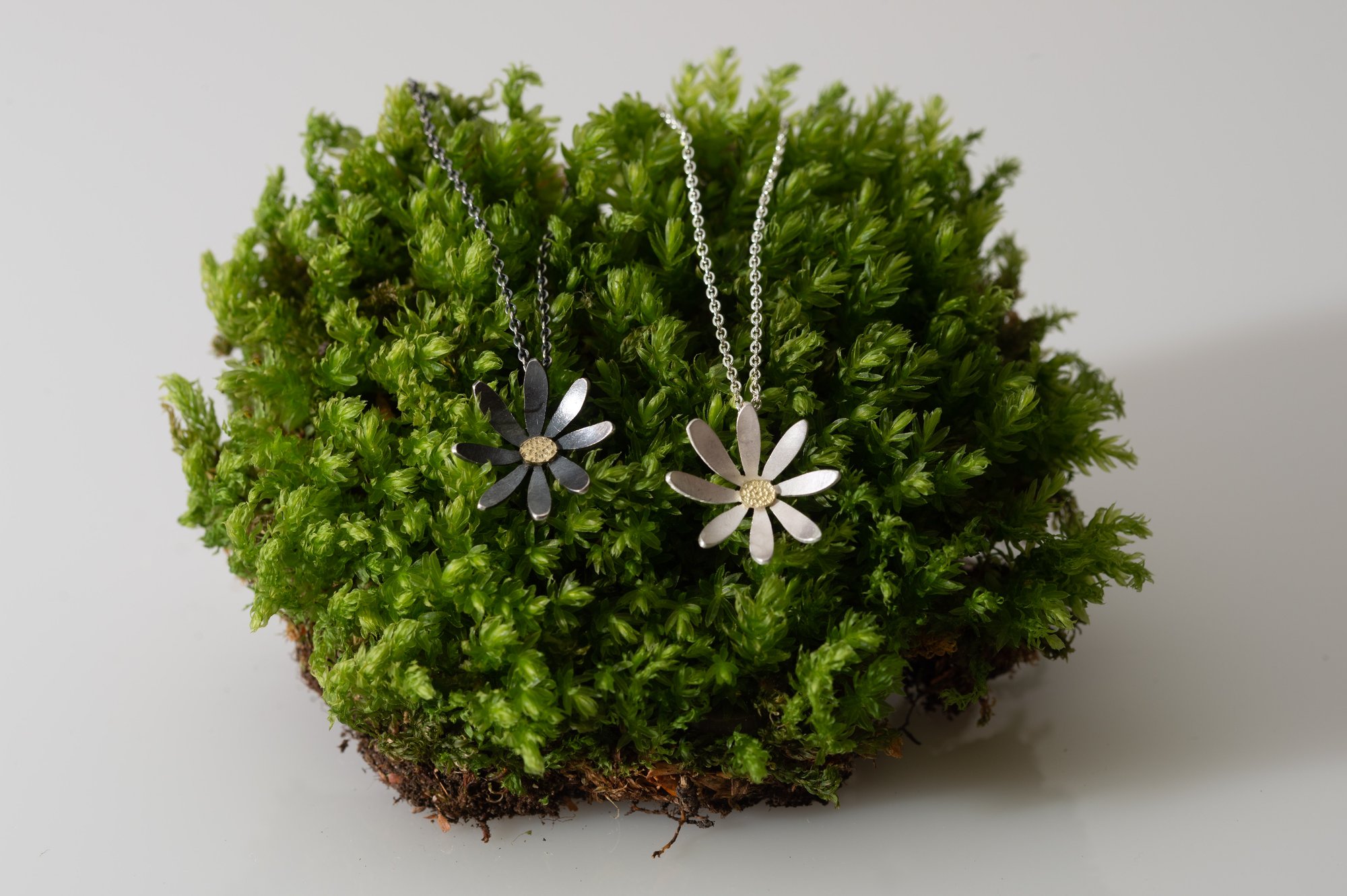 This pendant features a single silver daisy with an 18ct gold textured centre. The chain is 1mm close link silver trace chain. The pendant is light, simple and delicate; perfect for everyday wear or special occasions. The centre of the daisy is made from a hand cut and textured 18ct gold oval disk. This silver pendant has a contemporary brushed matt silver finish or alternatively in an antiqued vintage oxidised finish with slightly polished edges on the petals. Each daisy measures 15mm across. Please choose satin silver or oxidised silver when ordering. The pendant is finished with a handmade satin silver S hook clasp. You may find very slight variations from the daisy pictured as each is unique and handmade in my workshop. My pendants are made in three lengths; small (16"), medium (17") or long (18"). Please specify the length of chain you would like when ordering. A beautiful gift for those who love daisies and wildflowers.