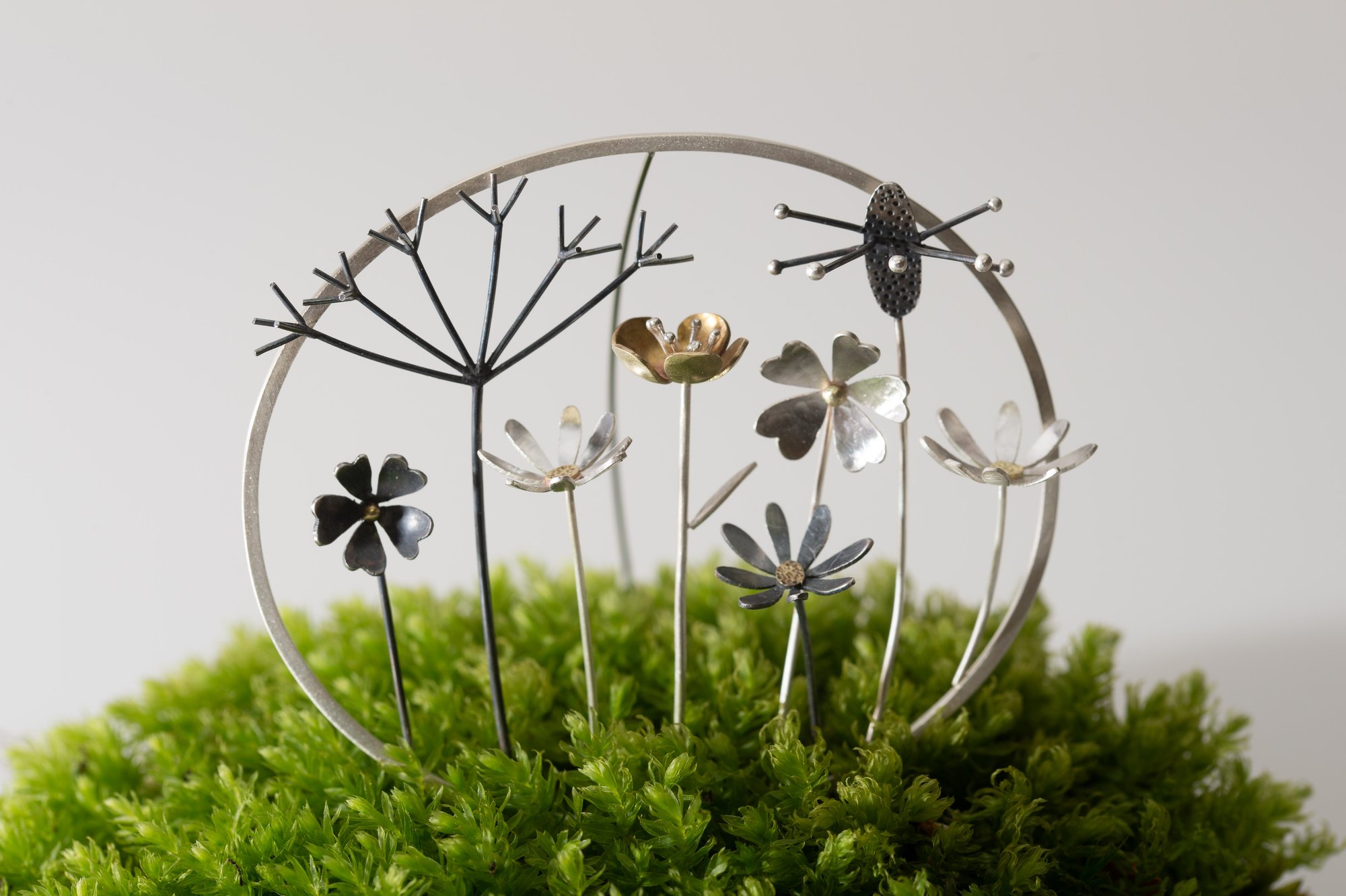 This brooch was made after the Countryfile Spring Special shown on BBC1 on 20 May 2018. It is a truly stunning silver oval brooch is inspired by wildflowers that are safe to pick. The brooch frame is made from square silver wire and is 75mm wide and 65mm in height. It features eight wildflowers including cow parsley, primroses, a brass buttercup, daisies and a ribwort plantain grass. The brooch pin is handmade from fine stainless steel wire with a silver revolver clasp. My large brooches are statement pieces of wearable nature. Each also has a life when not worn and can be placed on a surface as a framed piece of art. Another true collector's piece.